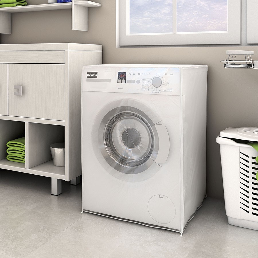 A capa é desenvolvida para máquinas com aberturas frontais. Seu material é plástico PVC cristal, de 0,8mm de espessura. A abertura da capa é feita através de zíper nas laterais e seu acabamento é em viés branco. Com duas opções de tamanhos, para se adaptar e proteger a máquina de qualquer arranhão e poeira.